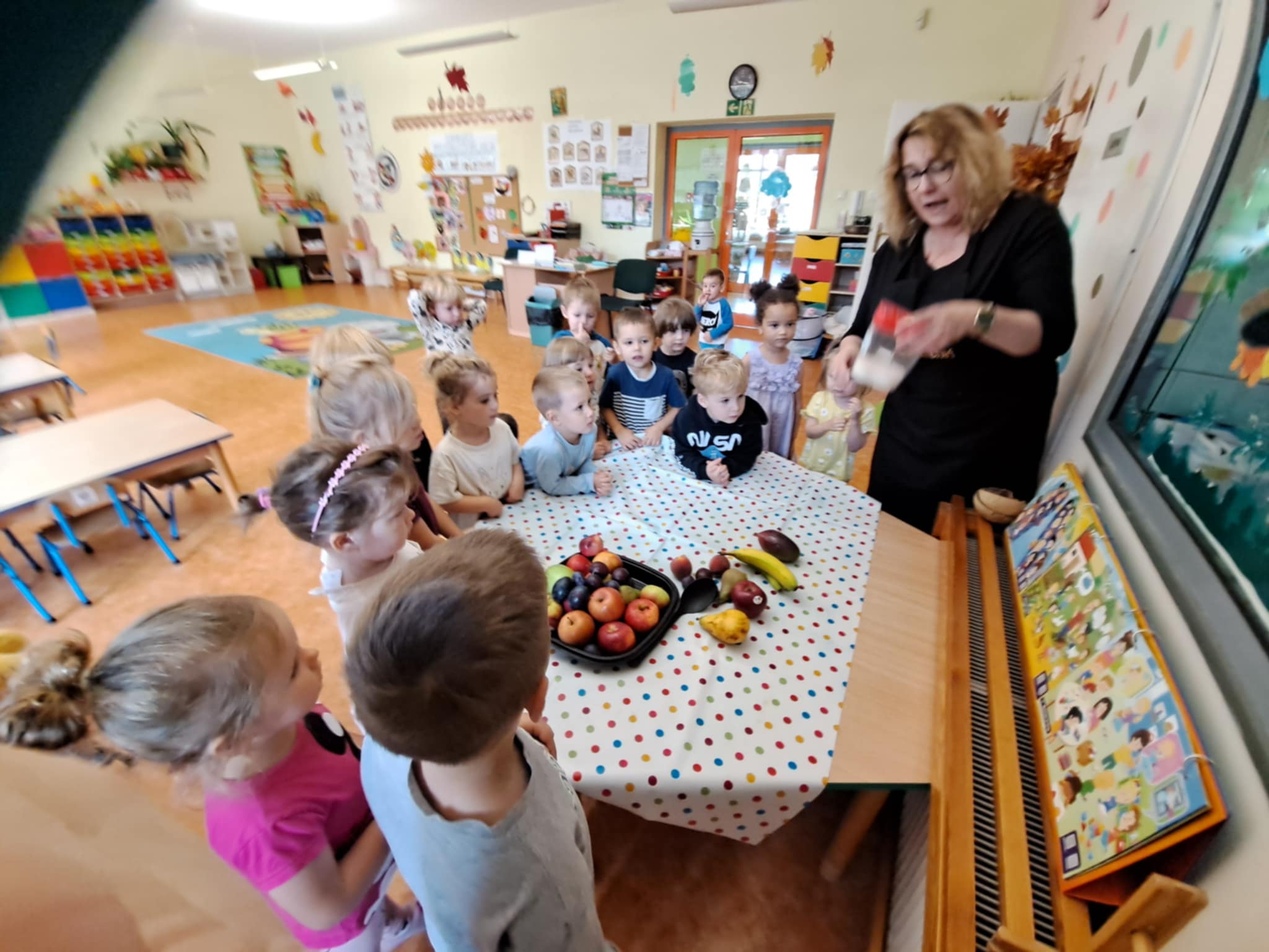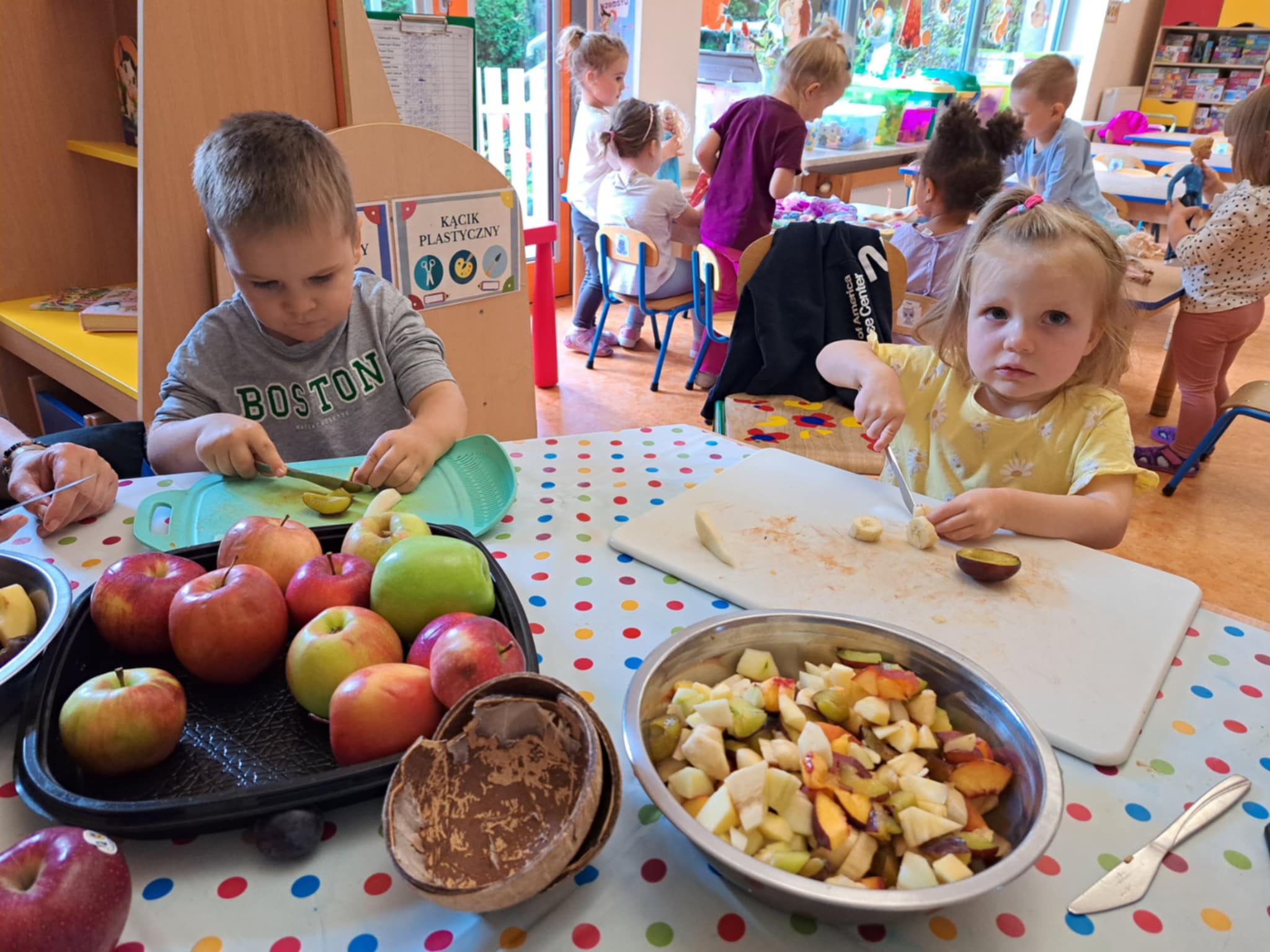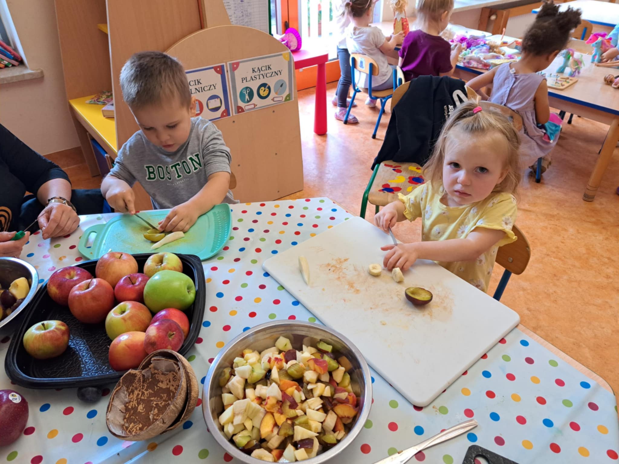 Najmłodsi z ogromnym zaangażowaniem kroili banany, jabłka, gruszki, winogrona i inne owoce. Każde dziecko miało swoje zadanie i prawdziwy nóż w ręku – oczywiście pod czujnym okiem pań nauczycielek.