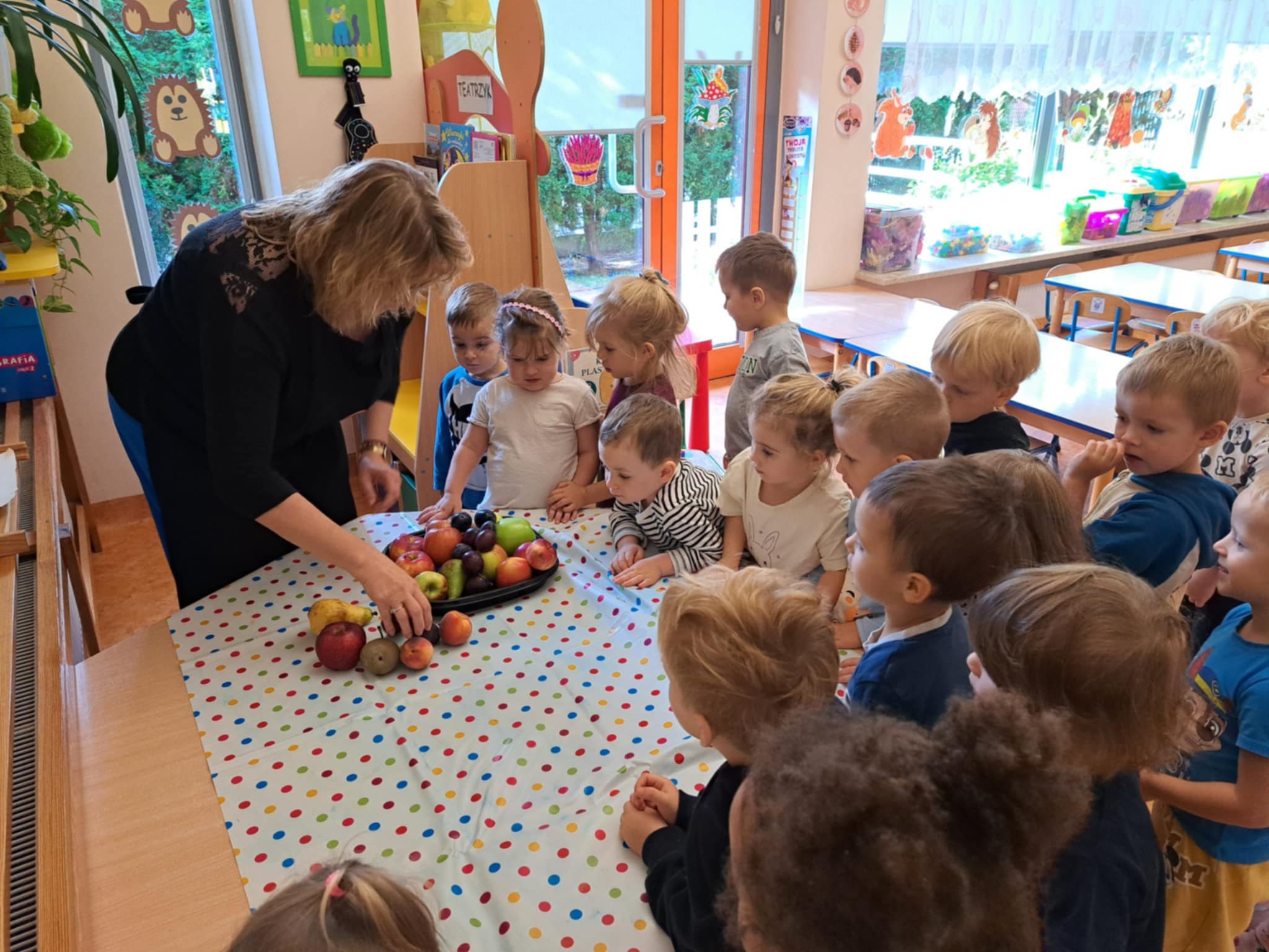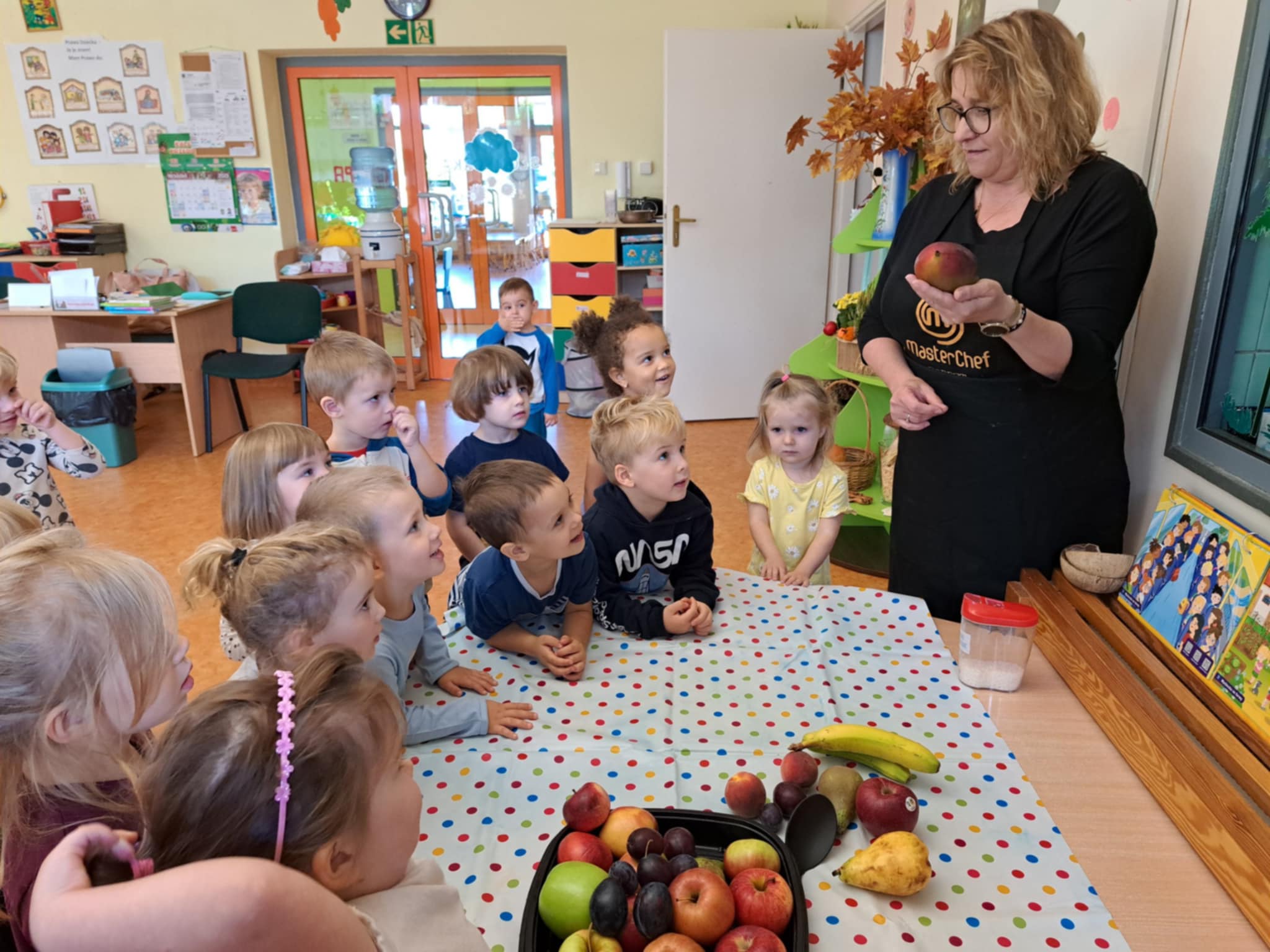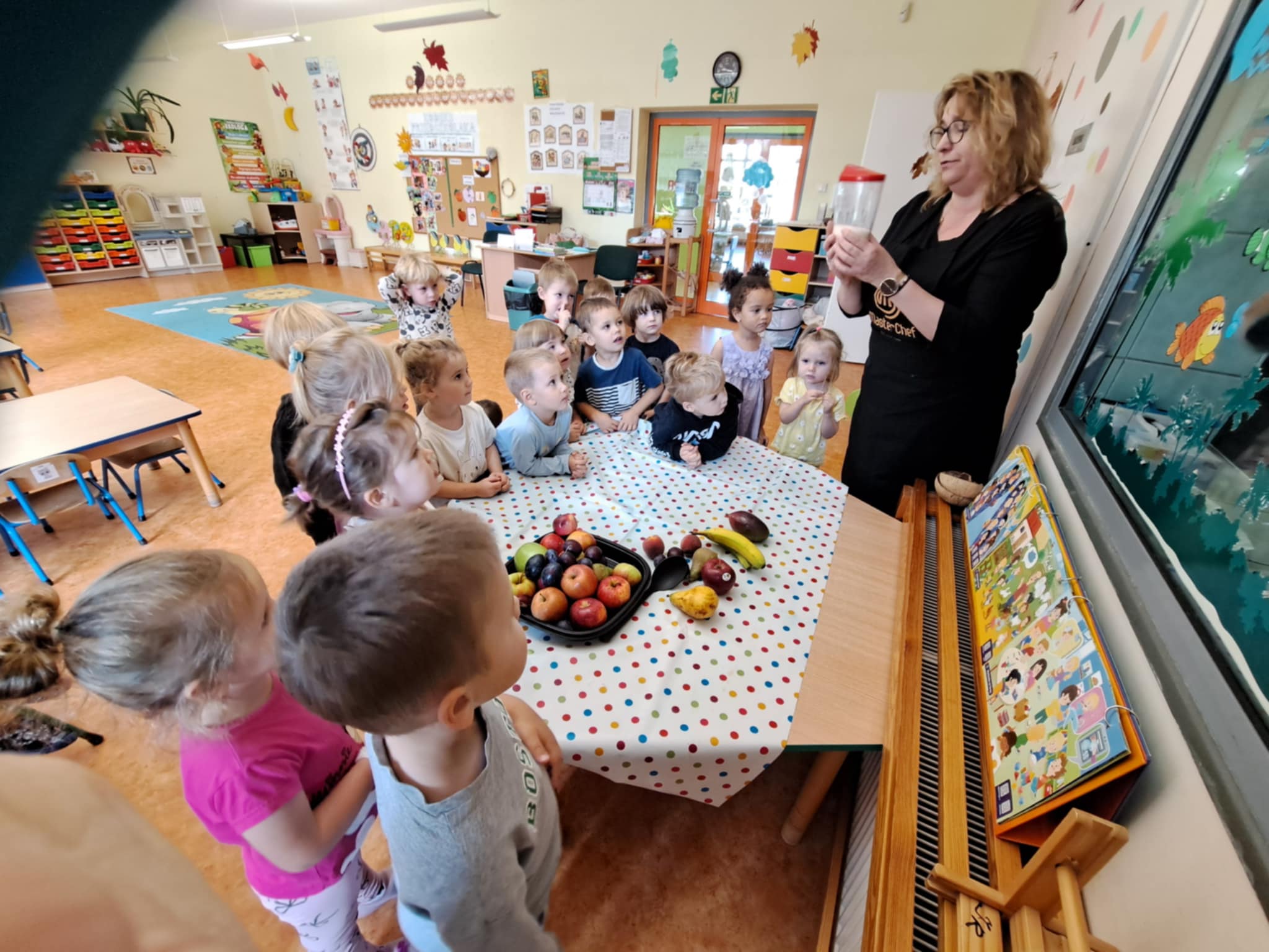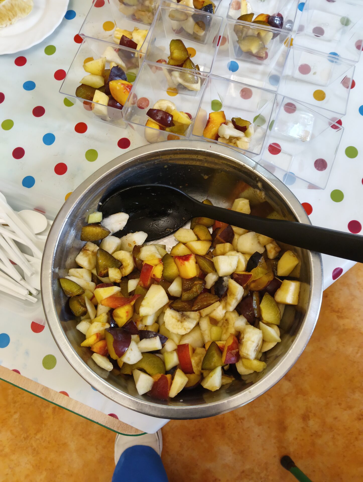 Najmłodsi z ogromnym zaangażowaniem kroili banany, jabłka, gruszki, winogrona i inne owoce. Każde dziecko miało swoje zadanie i prawdziwy nóż w ręku – oczywiście pod czujnym okiem pań nauczycielek.