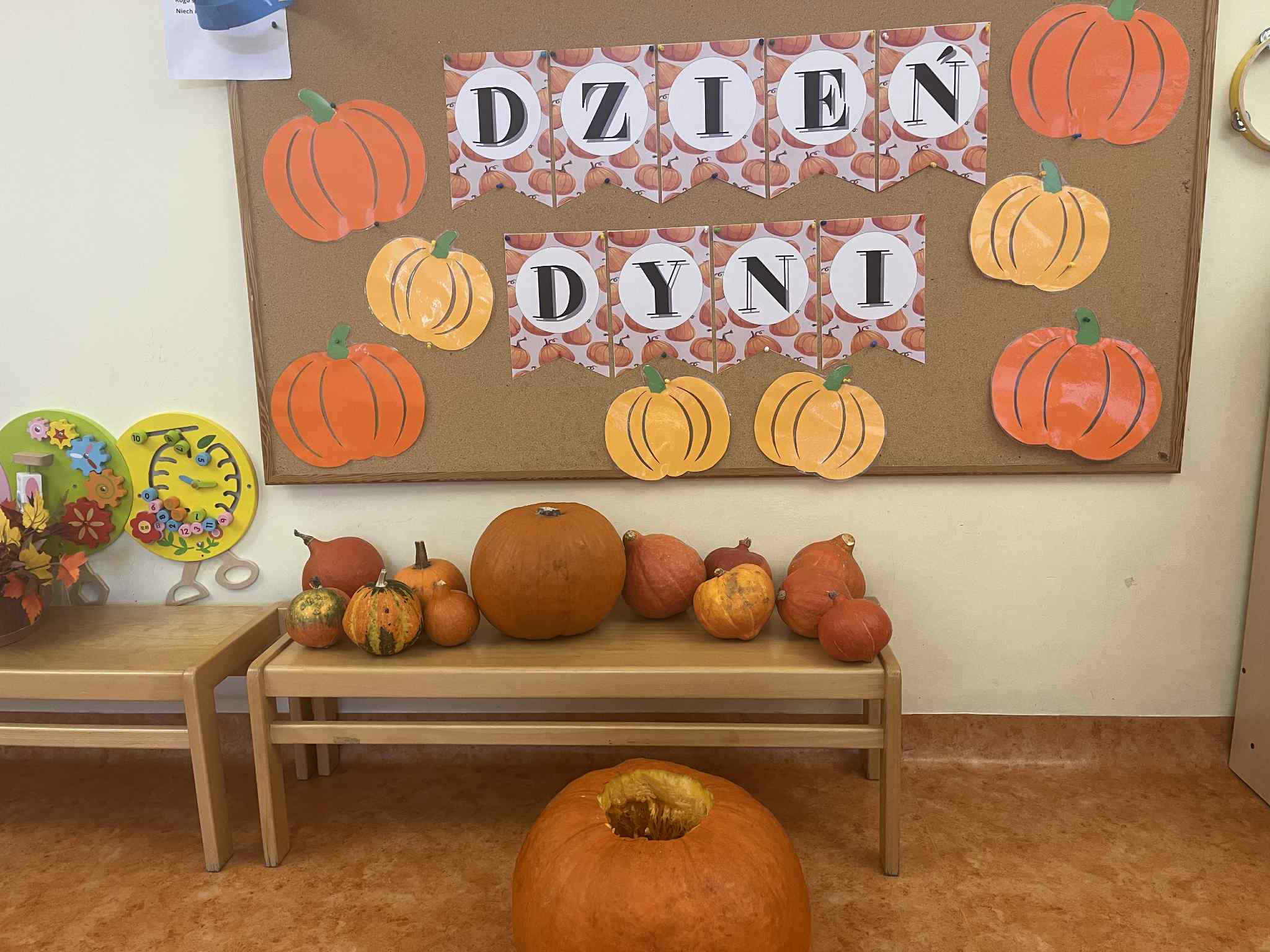 Maluszki poznawały różne rodzaje dyń, oglądały je z bliska, dotykały, wąchały i porównywały ich kształty oraz kolory. Wzięły udział w dyniowych zabawach ruchowych, tańcach przy muzyce i zajęciach plastycznych, podczas których powstały piękne, pomarańczowe prace.