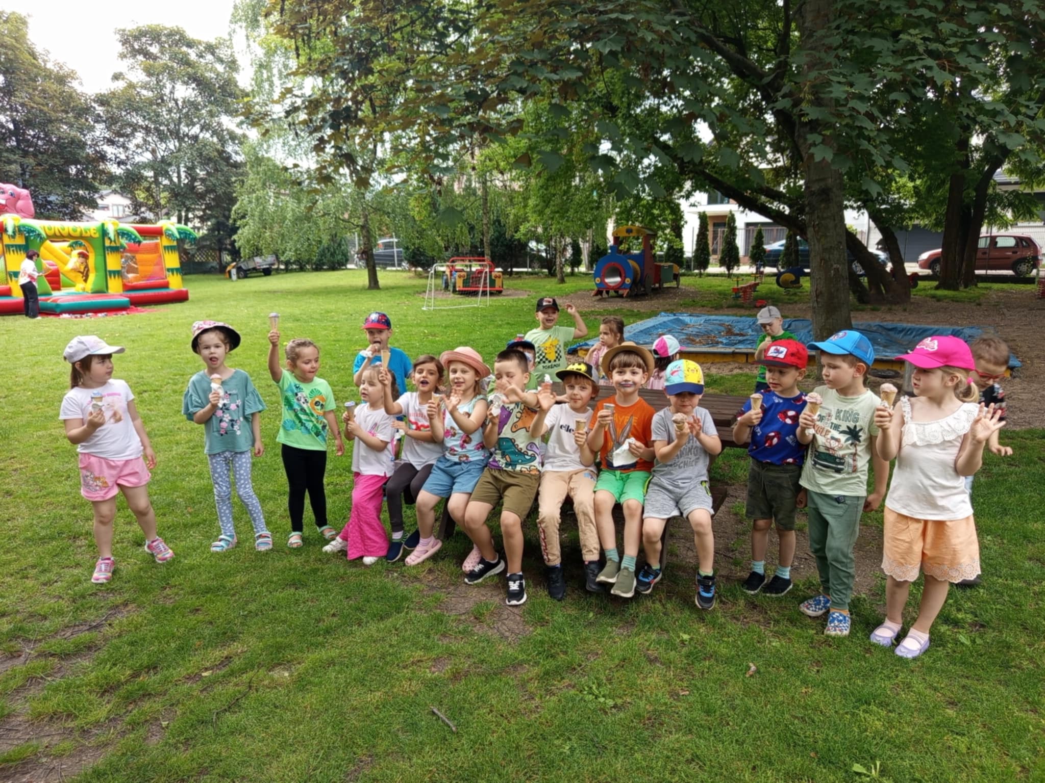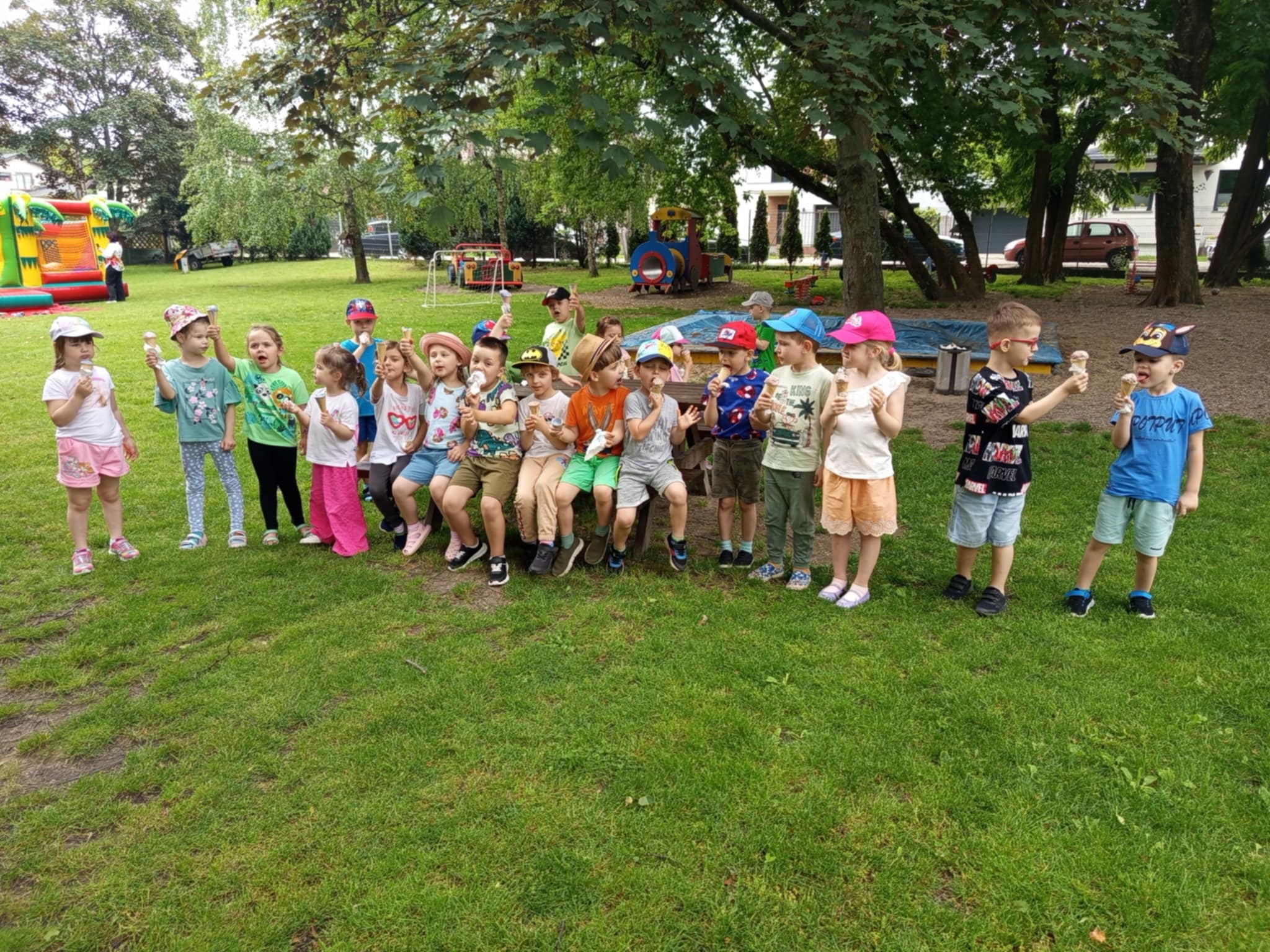 W gorący czerwcowy dzień nie mogło zabraknąć… lodów! Każdy przedszkolak dostał swoją porcję ulubionego smaku. To była chwila orzeźwienia i słodkiego relaksu, która wywołała kolejne szerokie uśmiechy.
