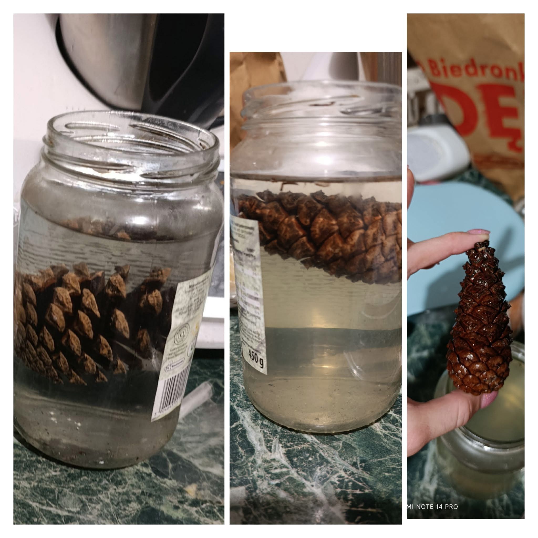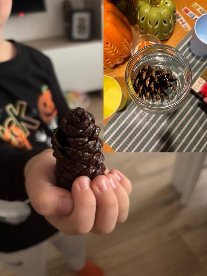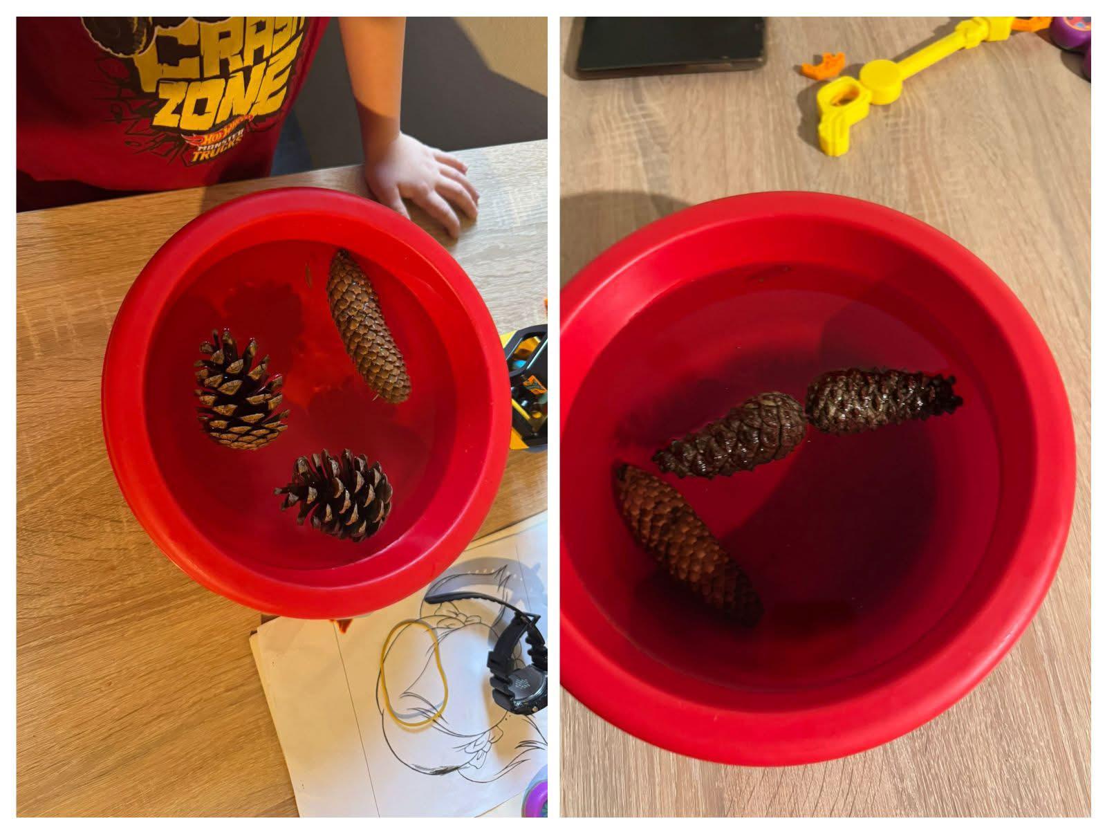 Nauka przez zabawę w grupie Pszczolki dzieci otrzymały do przeprowadzenia doświadczenie razem z rodzicami. Do naczynia z wodą włożyły szyszke, która była otwarta. Ich zadaniem było sprawdzenie co się stanie następnego dnia. Czy szyszka nadal będzie otwarta?
