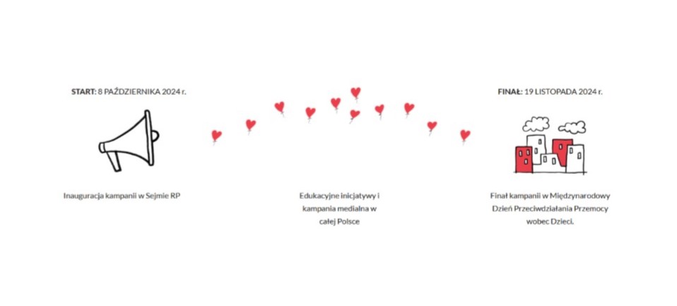 Inauguracja kampanii odbędzie się 8 października br. w Sejmie RP. Szczególnym, symbolicznym momentem akcji będzie jej finał 19 listopada br. w Międzynarodowym Dniu Przeciwdziałania Przemocy wobec Dzieci. Tego dnia budynki i inne obiekty w całej Polsce będą podświetlane na czerwono.