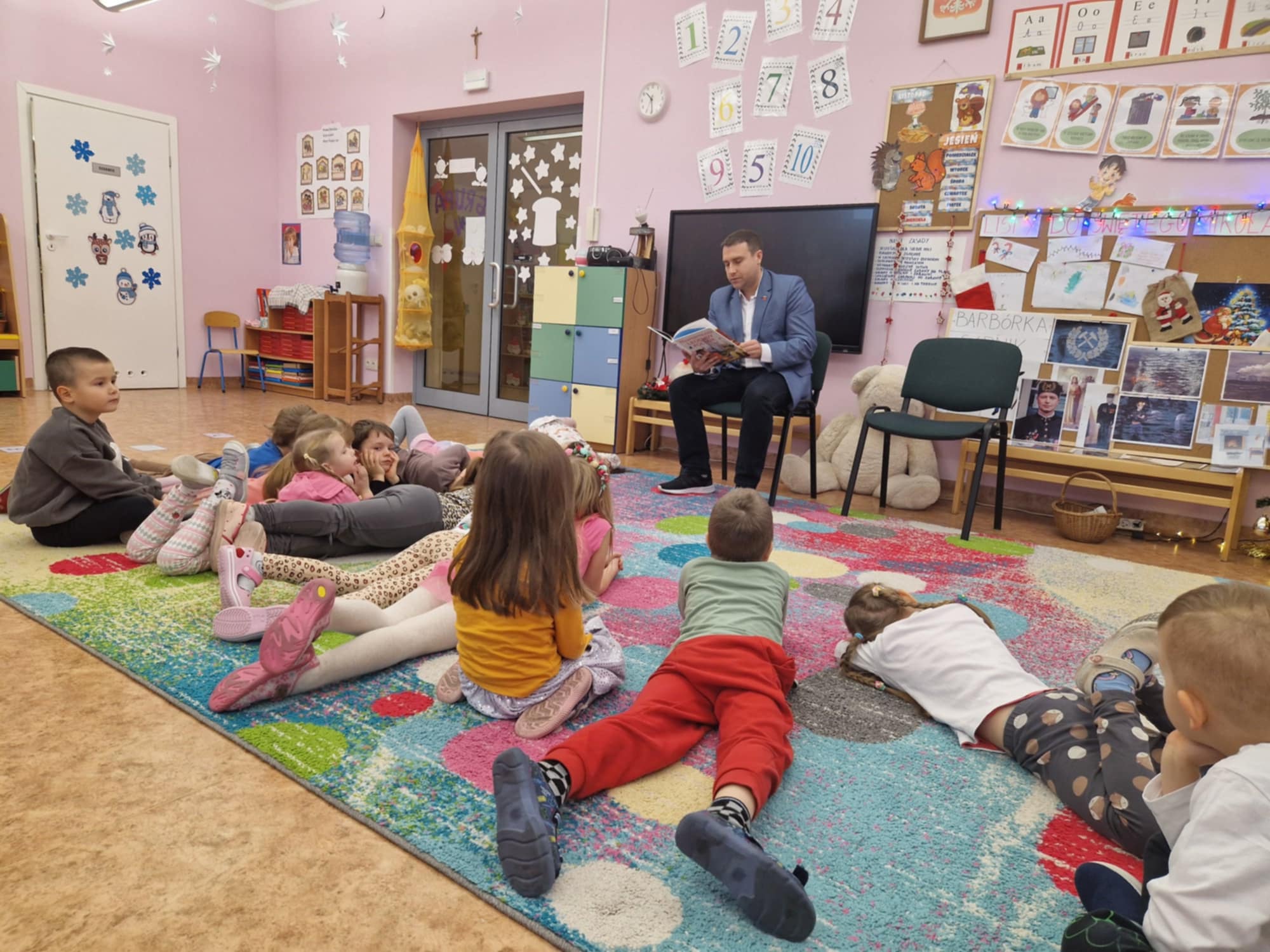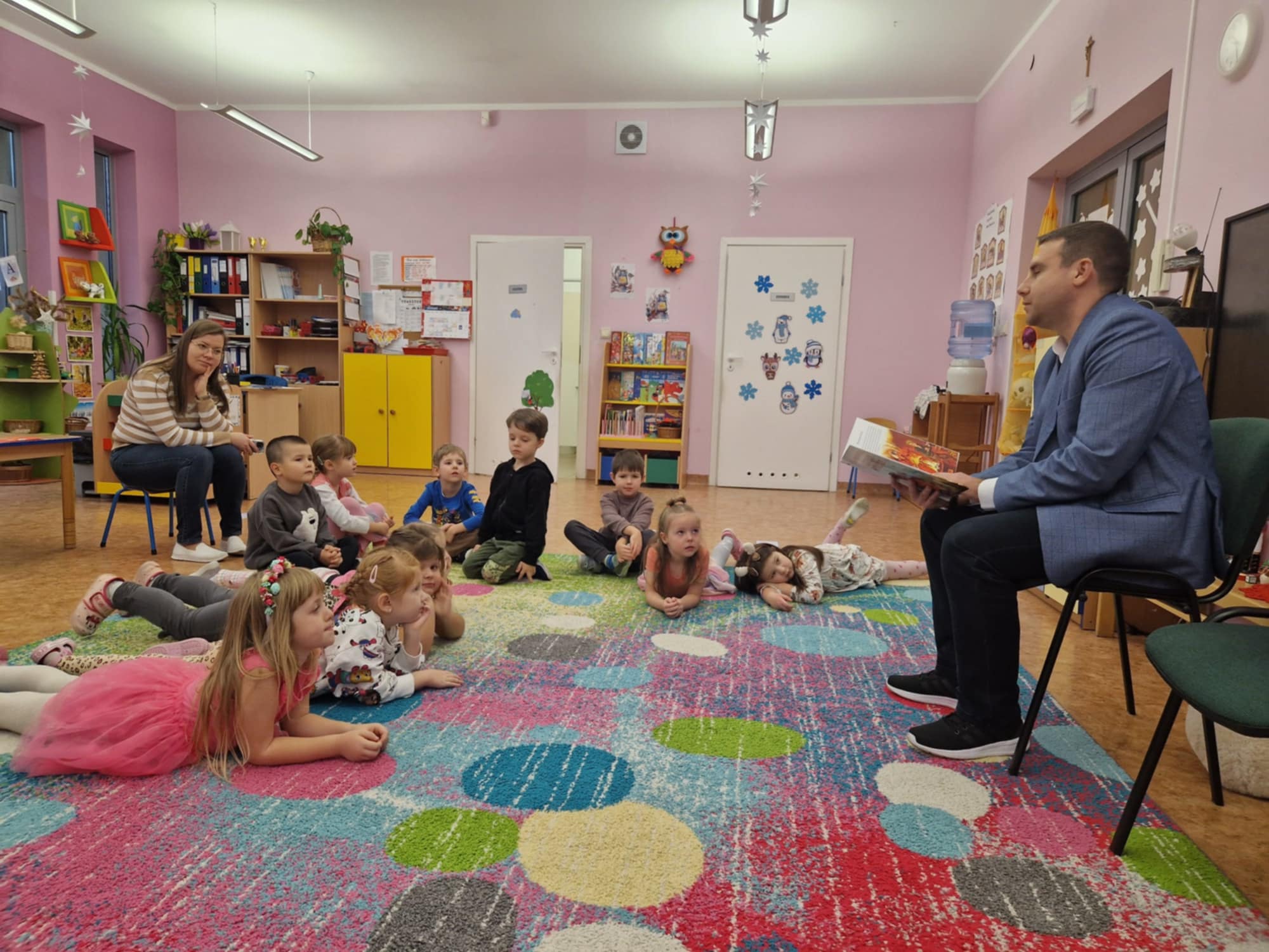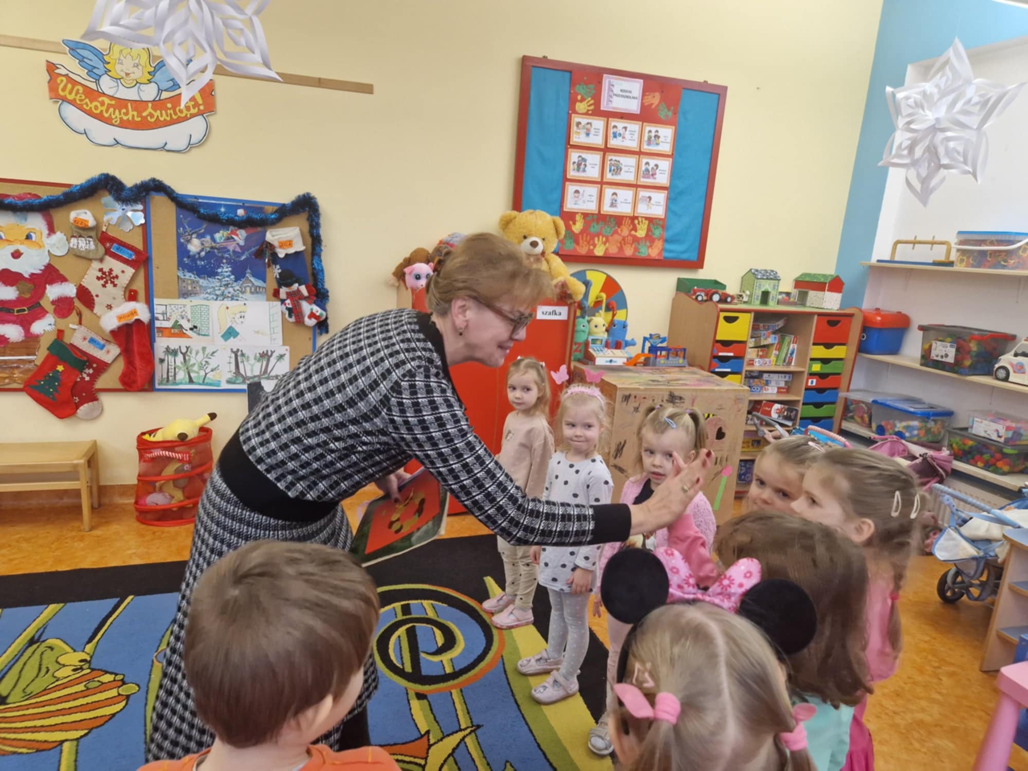 Maluchy z zaciekawieniem słuchały opowieści „O Smoku Wawelskim” oraz  „ O rybaku i złotej rybce”. Atmosfera była pełna radości i zaangażowania – dzieci chętnie zadawały pytania, a na zakończenie przybijały „piątki” z Panem Burmistrzem, dziękując za wizytę.