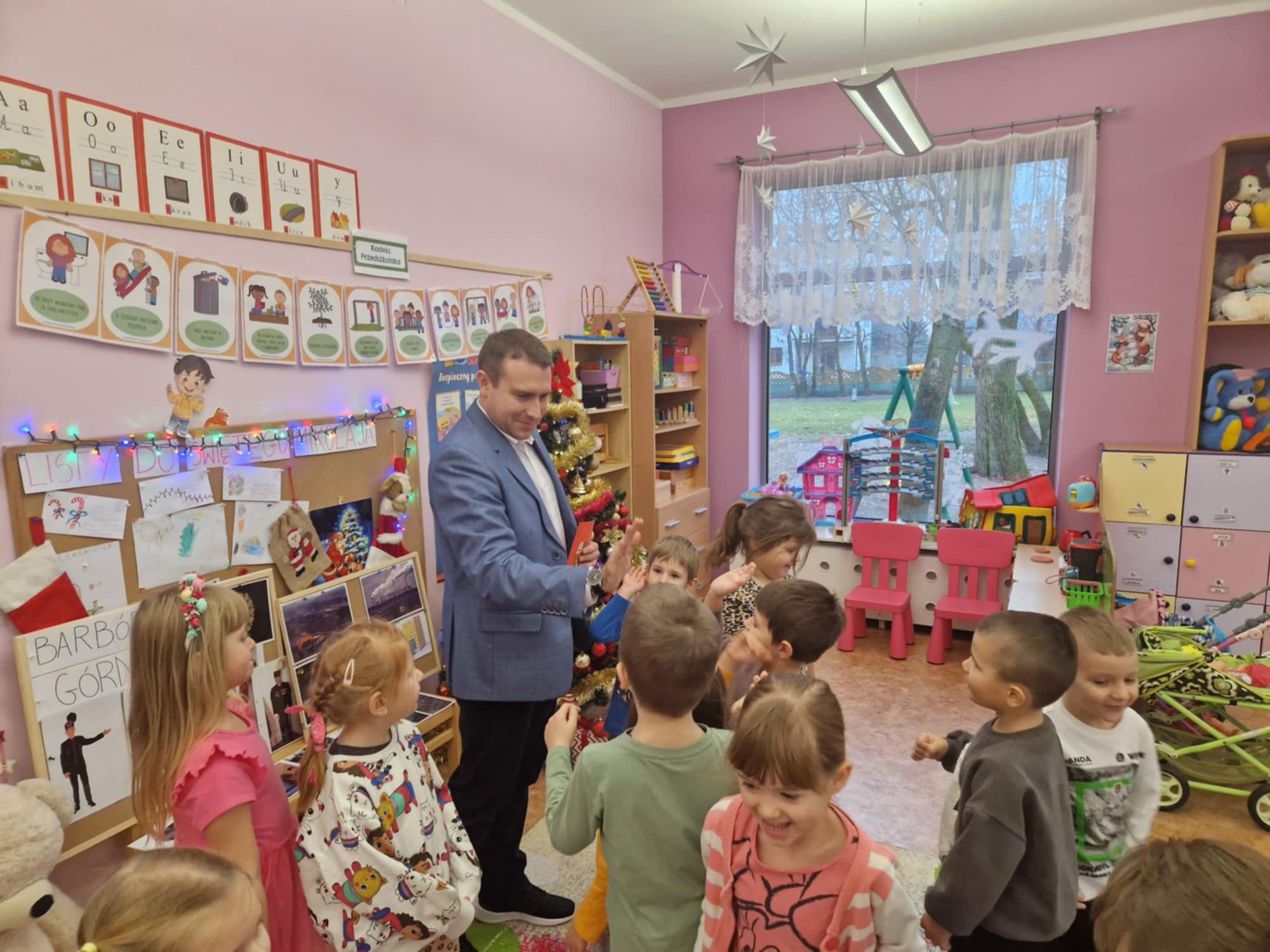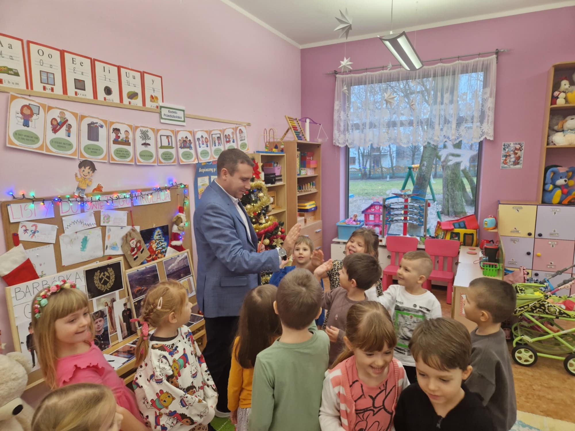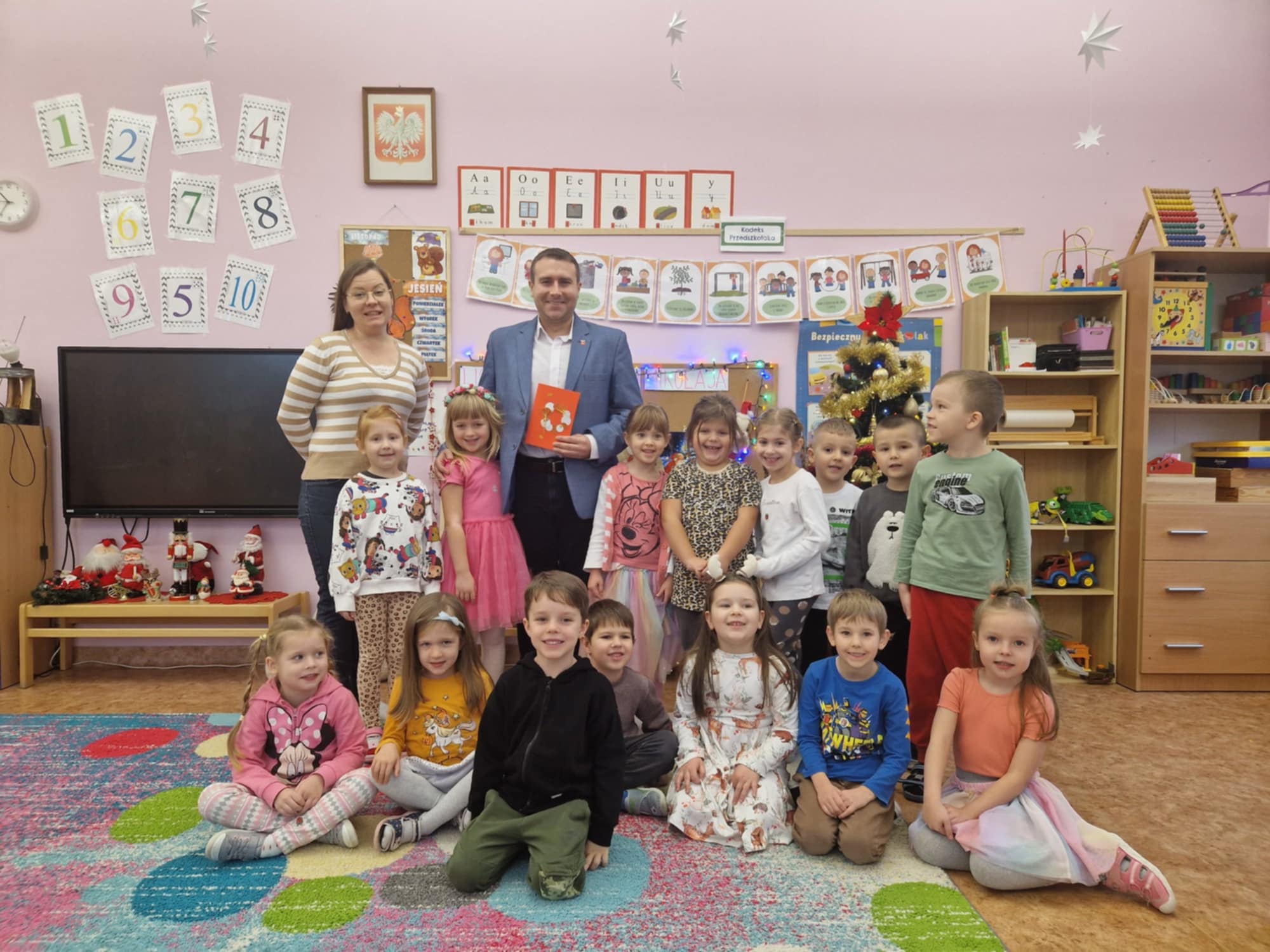 Maluchy z zaciekawieniem słuchały opowieści „O Smoku Wawelskim” oraz  „ O rybaku i złotej rybce”. Atmosfera była pełna radości i zaangażowania – dzieci chętnie zadawały pytania, a na zakończenie przybijały „piątki” z Panem Burmistrzem, dziękując za wizytę.