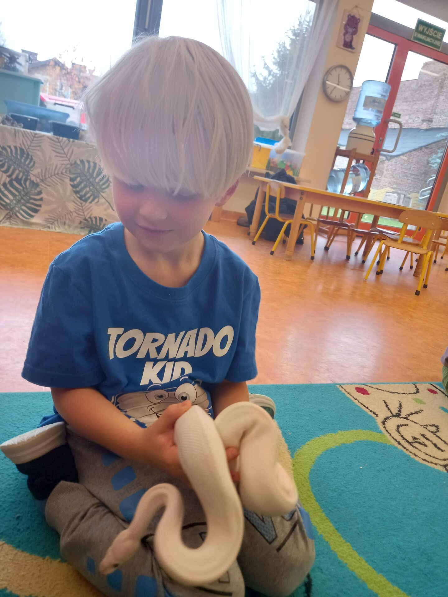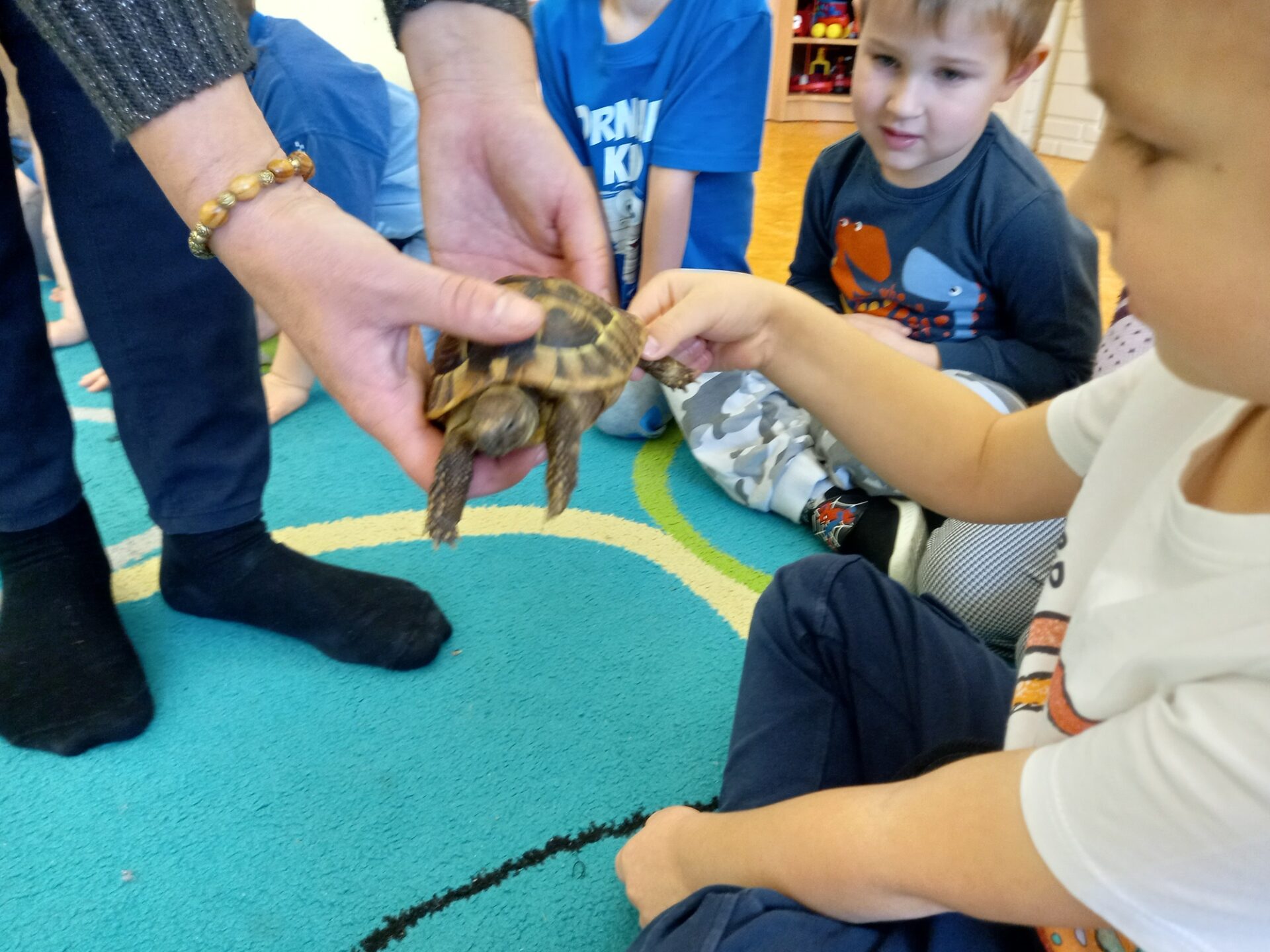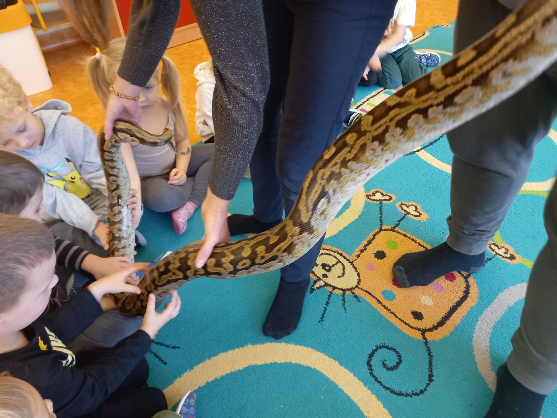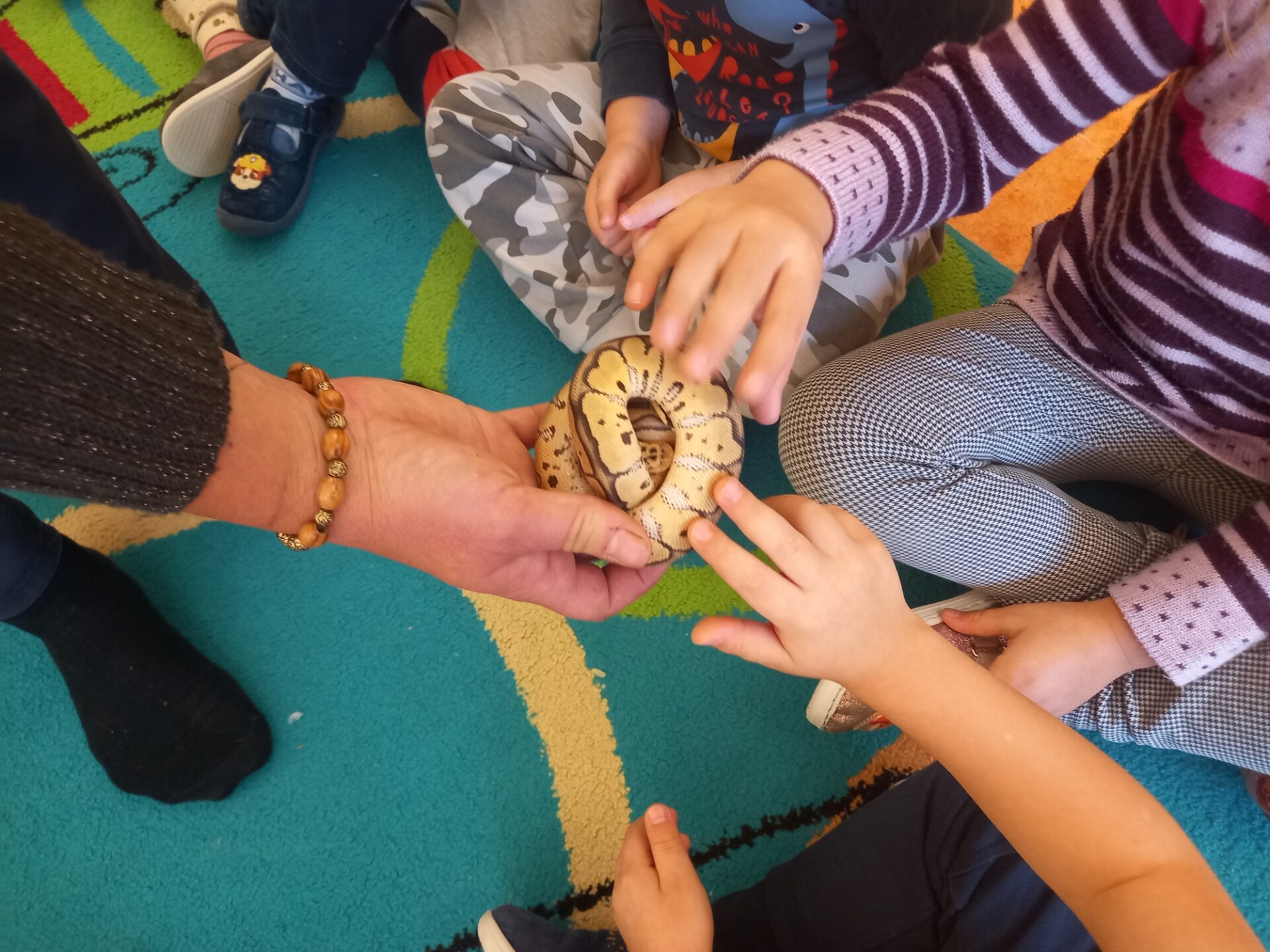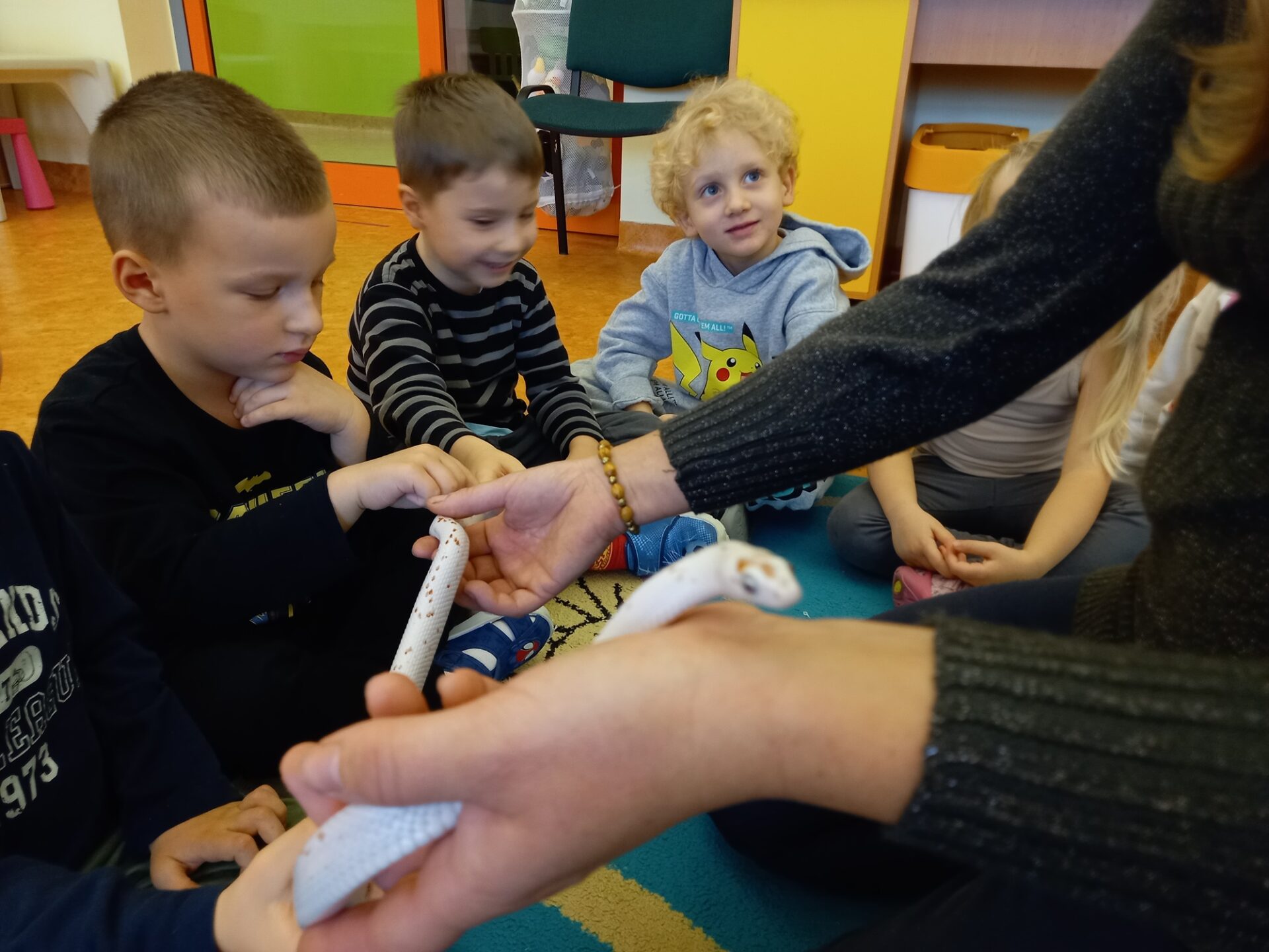 W grupie „Pszczółki” odbył się niezwykły pokaz gadów, który dostarczył dzieciom wielu emocji i nowych doświadczeń. Przedszkolaki miały okazję poznać różne gatunki zwierząt, m.in. kameleona, żółwie oraz węże. Dzieci dowiedziały się, skąd pochodzą te zwierzęta, co lubią jeść oraz w jaki sposób spędzają swój „wolny czas”.