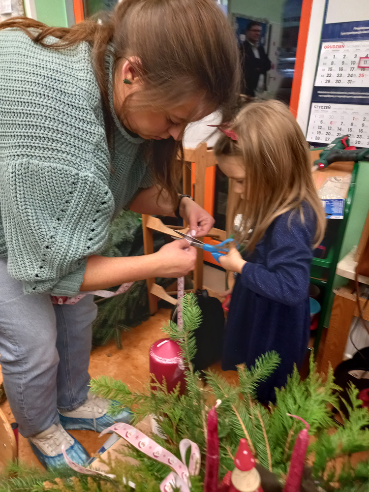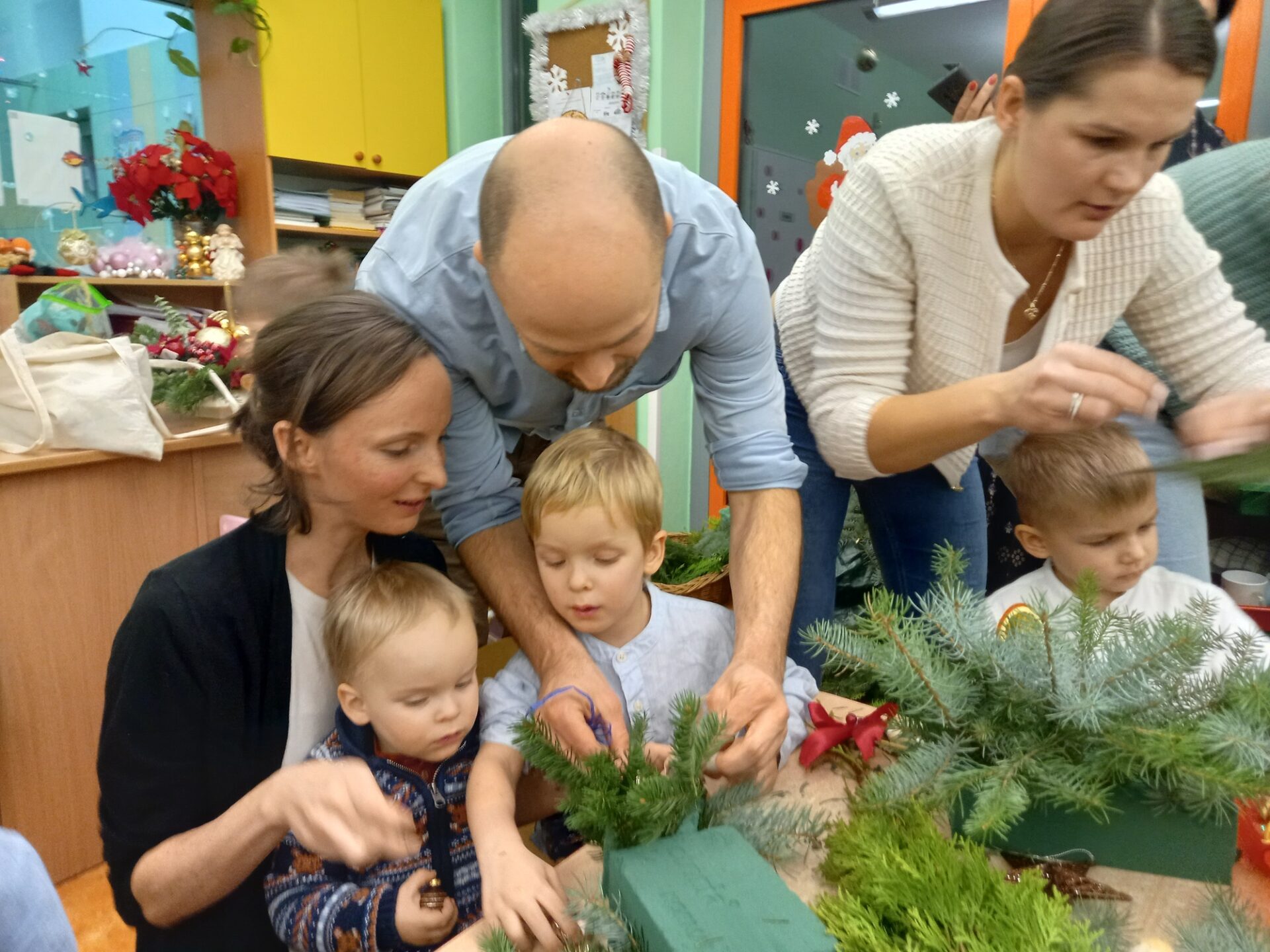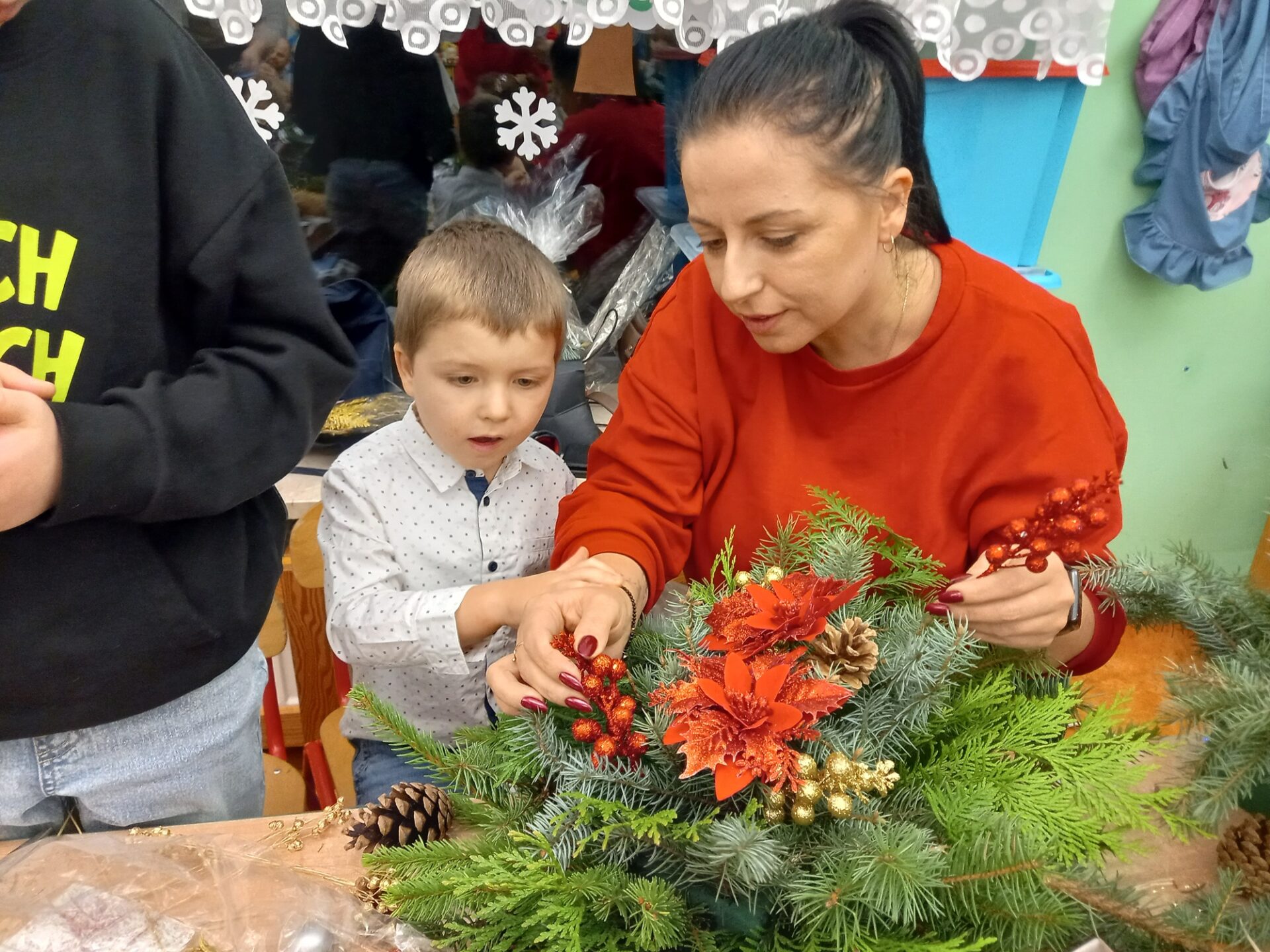 Po części artystycznej przyszedł czas na warsztaty z rodzicami pt. „Stroik świąteczny”, podczas których dzieci wraz z opiekunami tworzyły własne, niepowtarzalne dekoracje. Była to doskonała okazja do rozmów, współpracy i wspólnego spędzenia czasu.