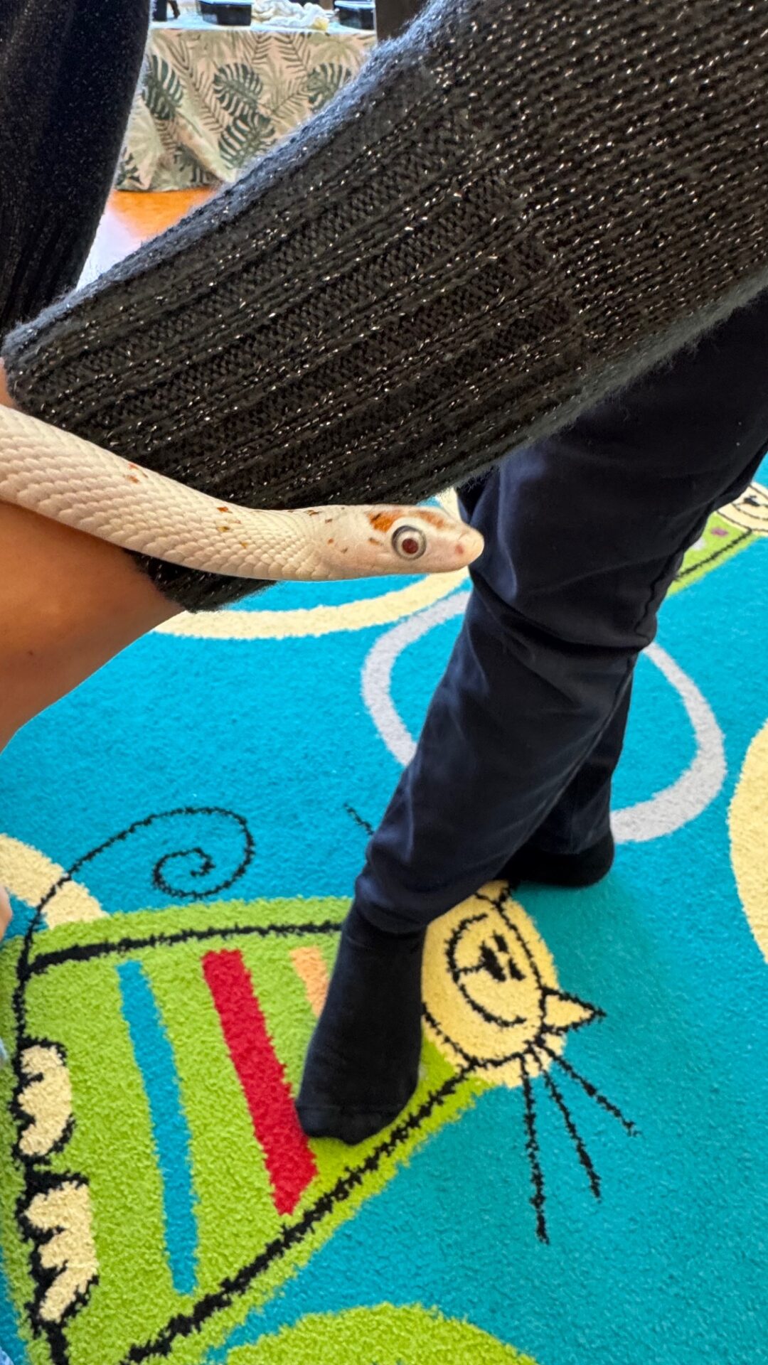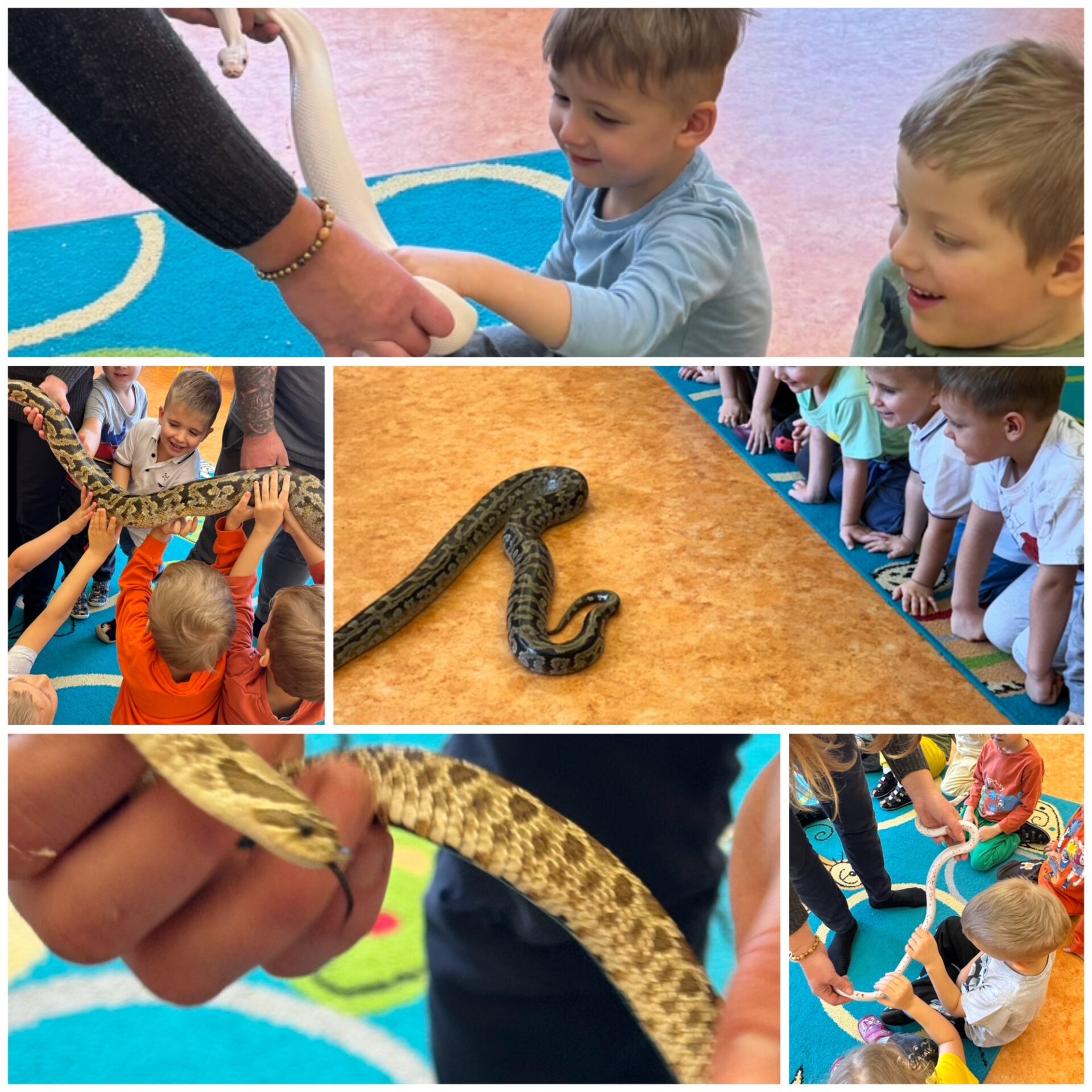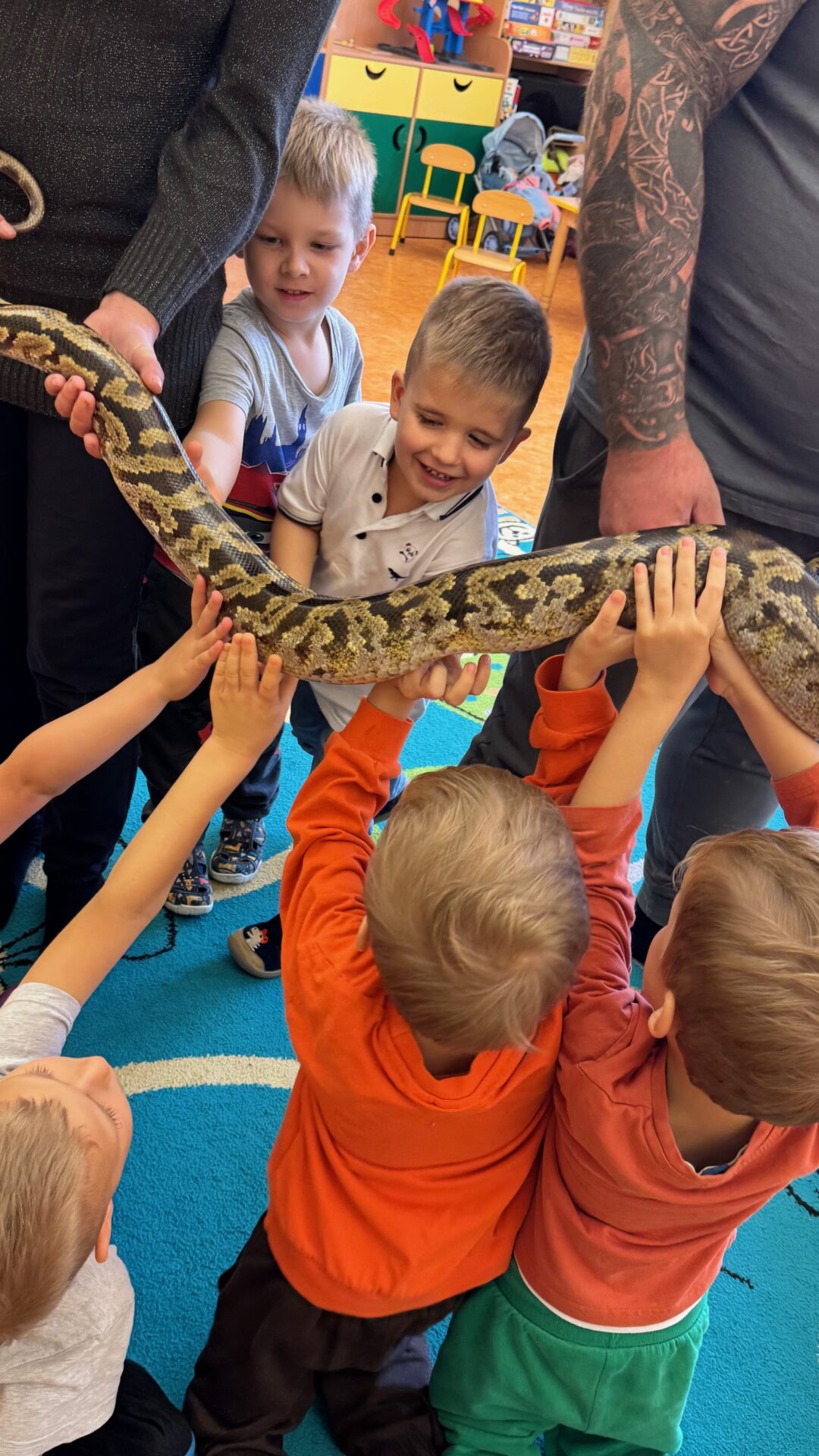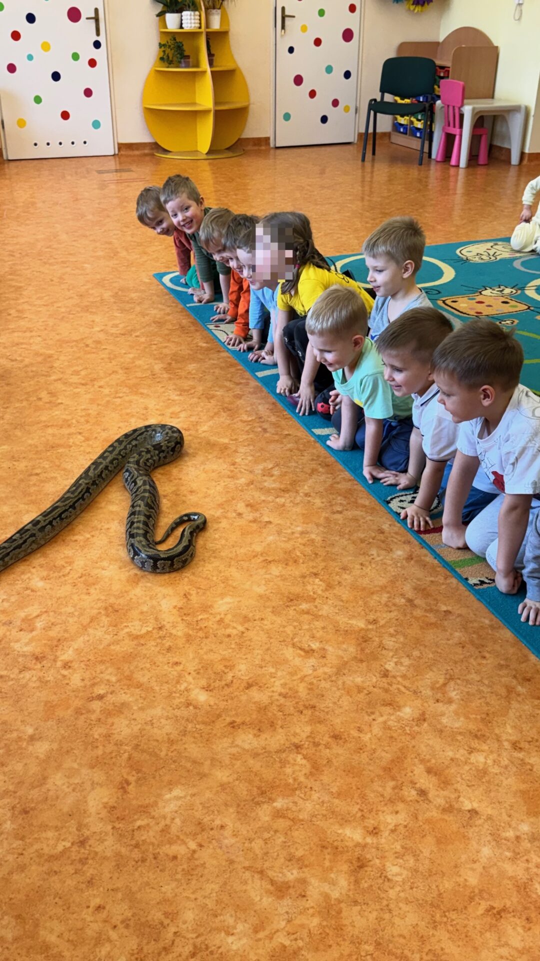 Podczas spotkania przedszkolaki miały okazję z bliska zobaczyć i poznać różne gatunki gadów – ich wygląd, sposób poruszania się, odżywiania i zachowania. Dowiedziały się, czym różni się wąż od jaszczurki, dlaczego gady lubią ciepło i jak chronią się w naturze.